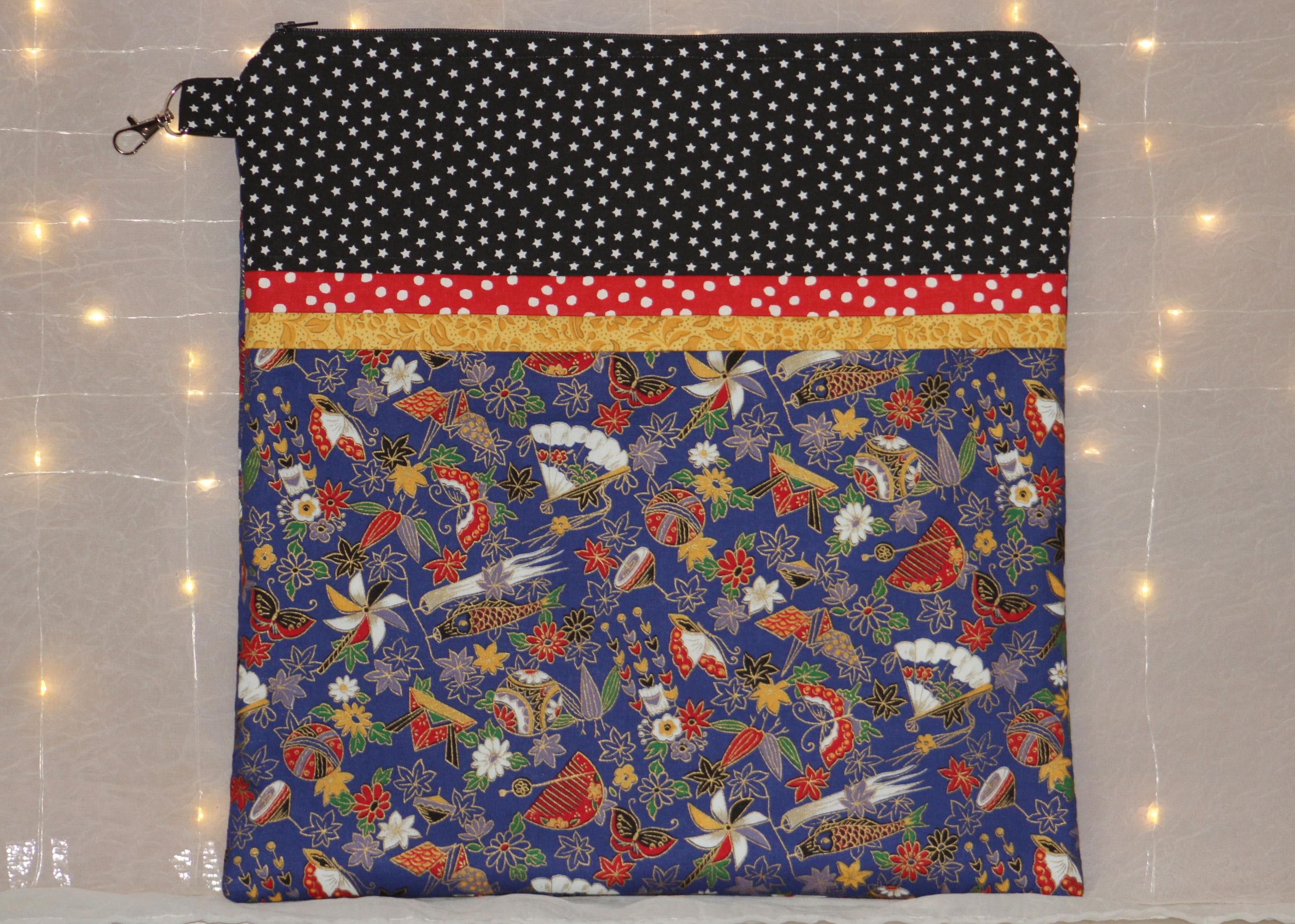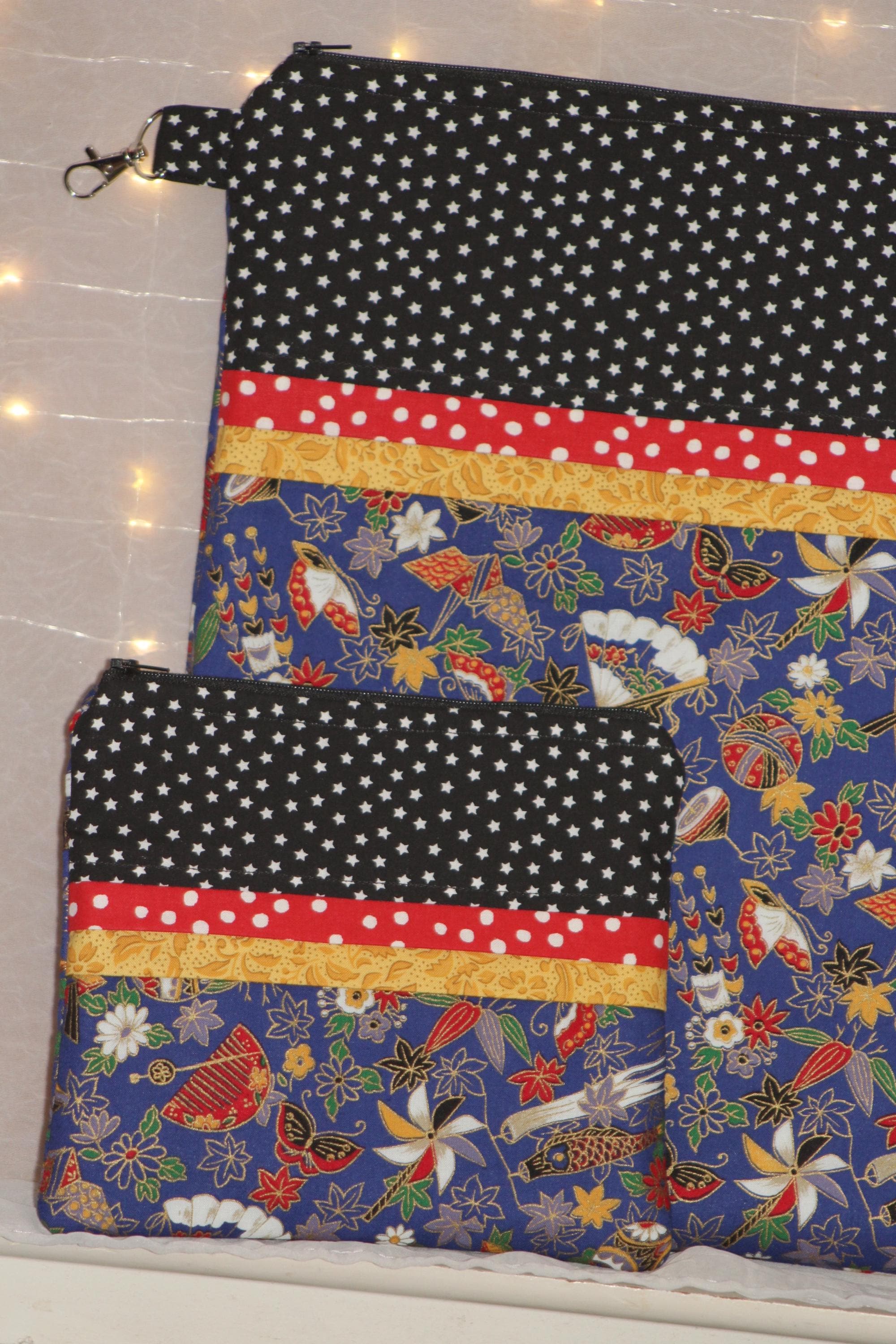 This fun set is made of cotton fabric, zippers, and batting in my smoke-free home studio.