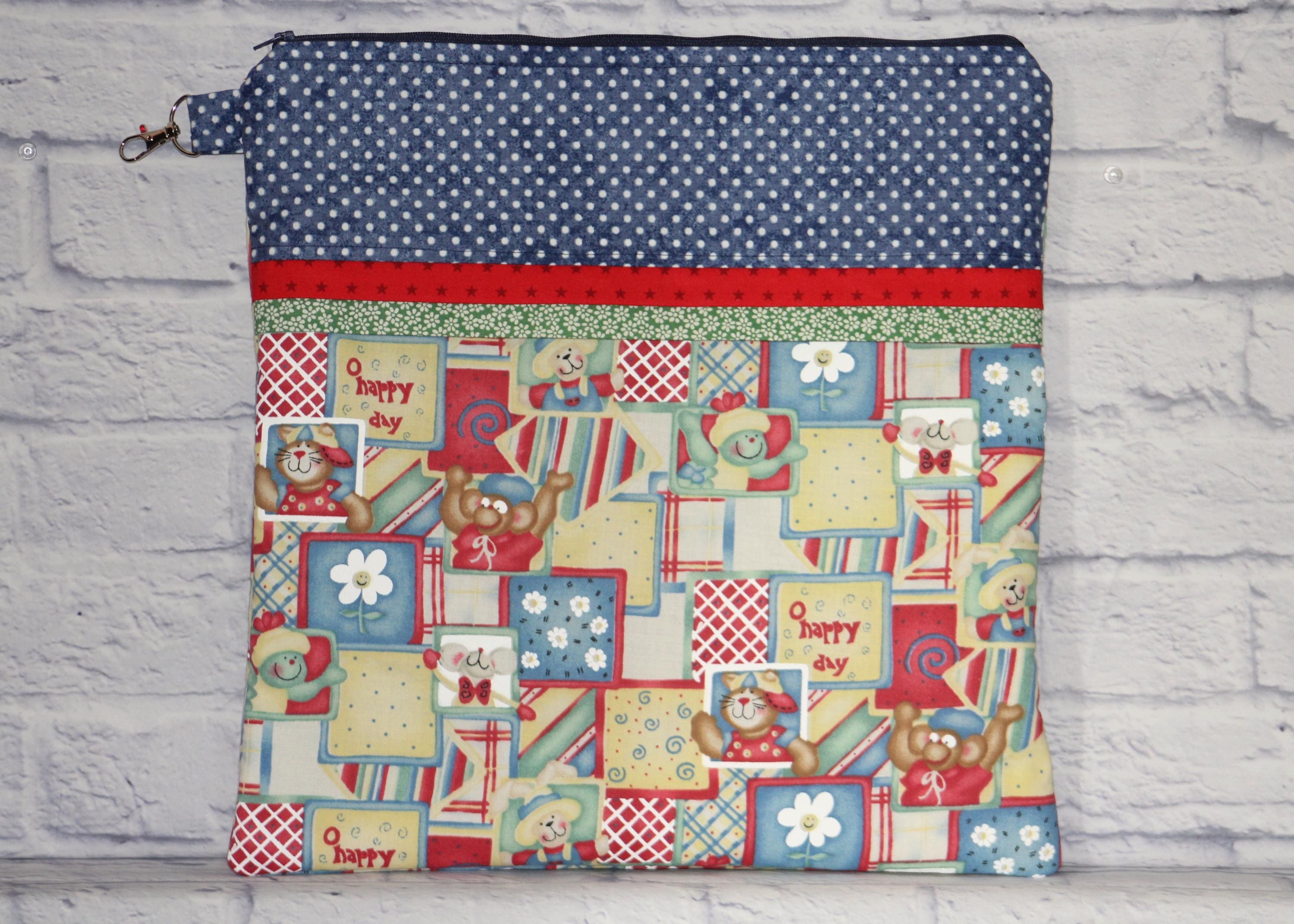 This fun set is made of cotton fabric, zippers, and batting in my smoke-free home studio.