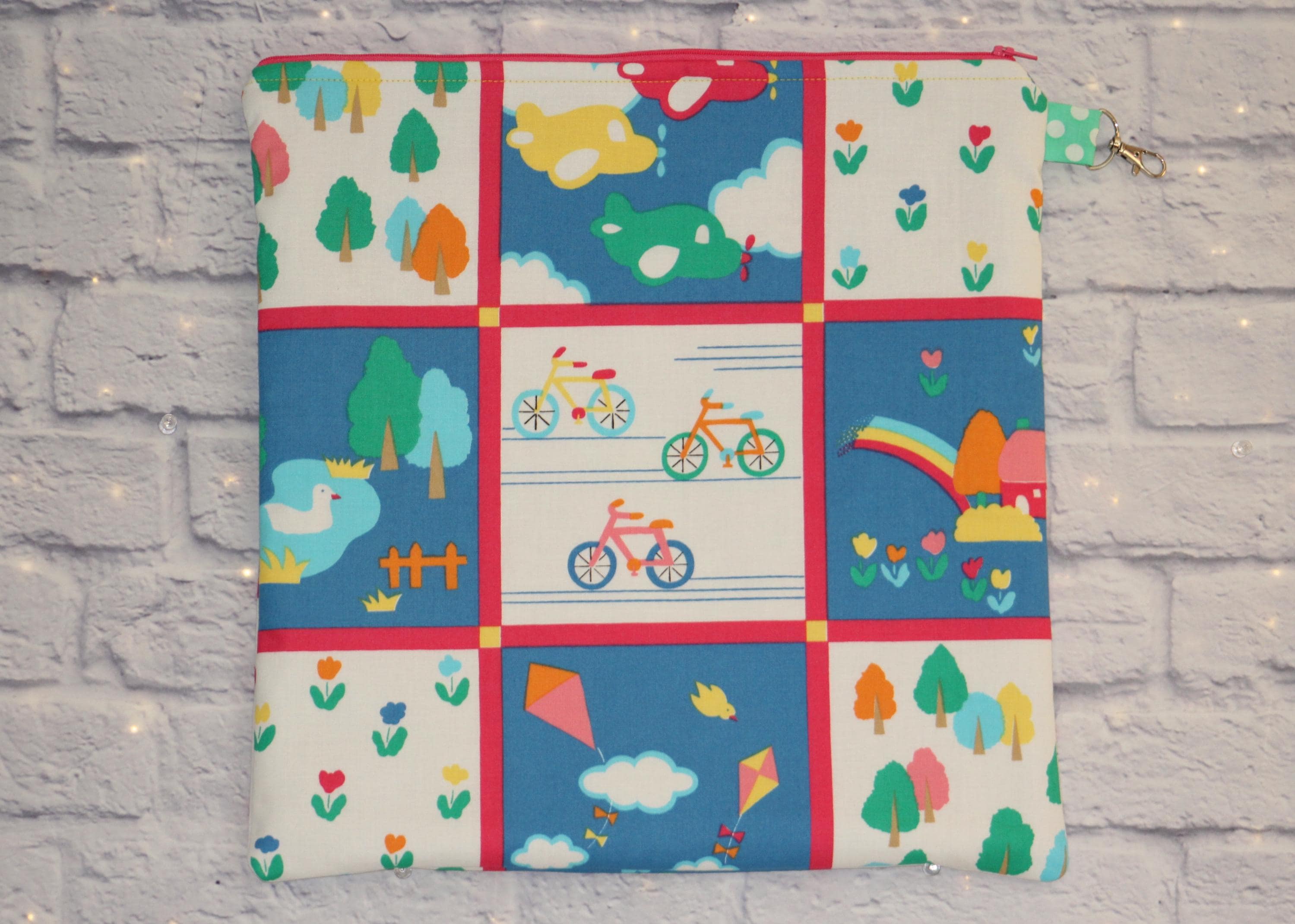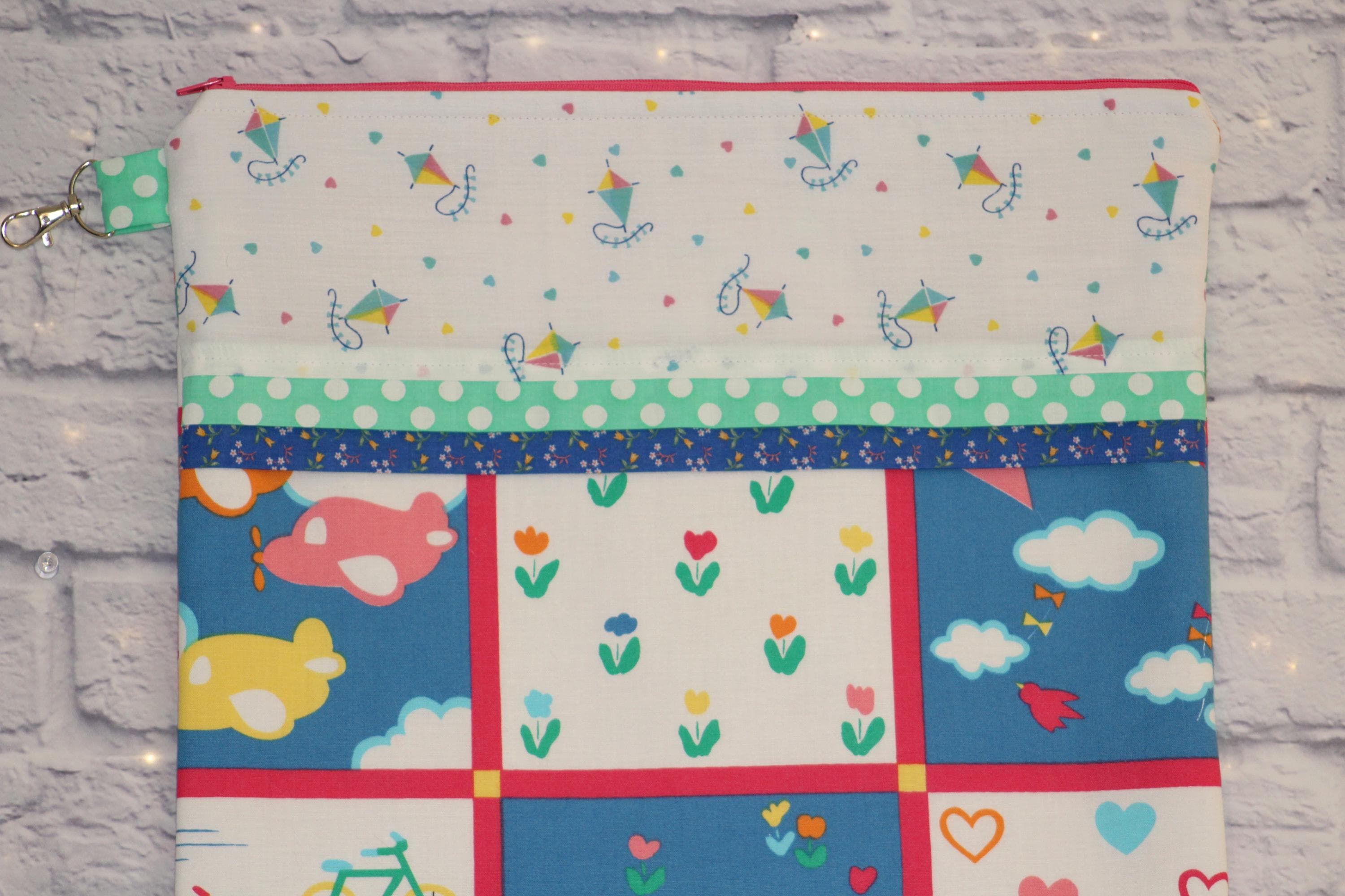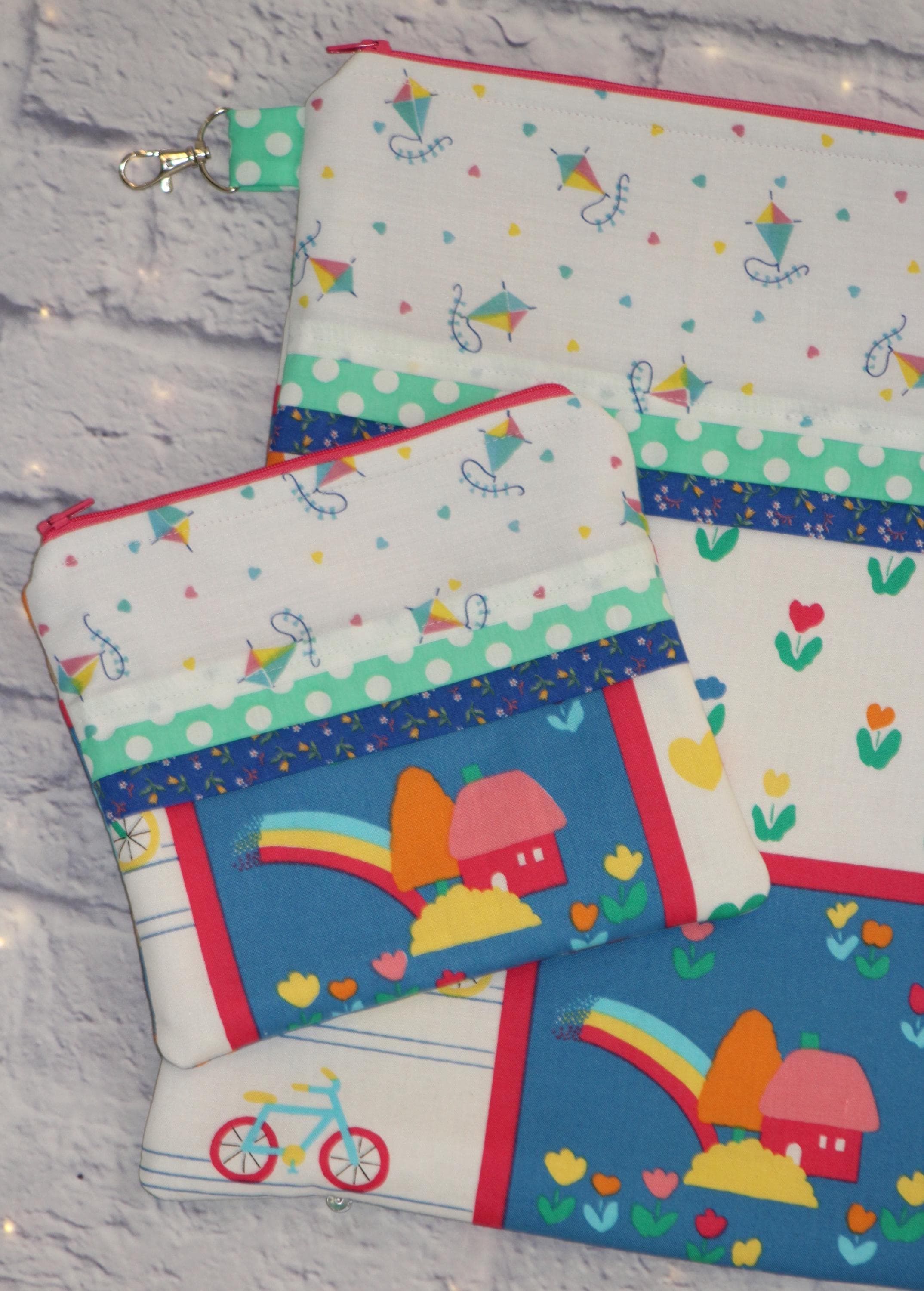 This fun set is made of cotton fabric, zippers, and batting in my smoke-free home studio.